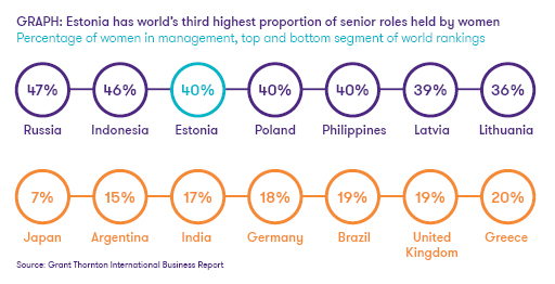 This information is based on the latest global survey conducted by tax and business advisory firm Grant Thornton. We surveyed over 5,500 companies’ CEOs and other executives in 36 countries at the end of last year. The survey results showed that Eastern European and Asian countries had the greatest share of women in management board positions. Russia had the highest share of female executives, with 47% of executive positions are occupied by women. Estonia was third of 36 countries in terms of number of female execs (40%), and Latvia and Lithuania came in sixth and seventh (39% and 37%, respectively).