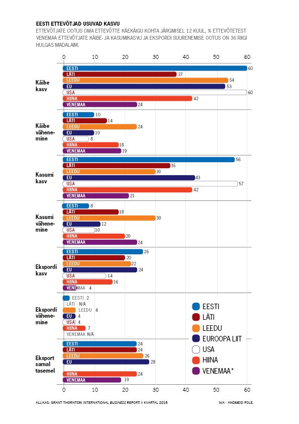 Kuid see pole veel kõik. Meie ettevõtjad on Euroopa Liidu riikidest ka käibekasvu osas ühed optimistlikumad: 60% Eesti ettevõtetest usub, et suudab järgmise 12 kuu jooksul käivet kasvatada. Veel positiivsemalt meelestatud on ainult iirlased, rootslased, hispaanlased ja hollandlased. Võrreldes tänavuse I kvartaliga on jõudsalt kasvanud USA ettevõtjate arv, kes usuvad käibekasvu: 47 protsendilt 60-le.