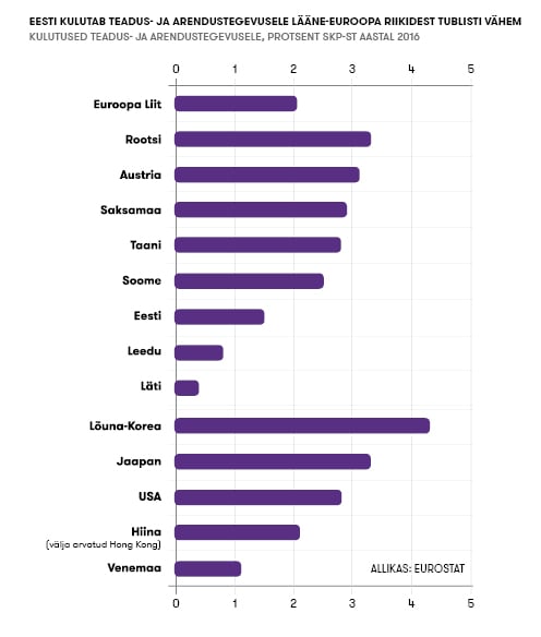Ettevõtete investeeringute jaotust vaadates on Eesti olukord eriti kummastav. Ühelt poolt loome endast maailmas pilti kui innovaatilisest e-riigist. Teisalt läheb ettevõtete niigi väikesest investeeringute kogumahust alla kolmandiku inimeste koolitamisse ning teadus- ja arendustegevusse, ülejäänu aga seadmetesse ja masinatesse (allikas: Tallinna Tehnikaülikooli uuring „Kas ettevõtete investeeringud jõuavad tootlikkuseni?”).