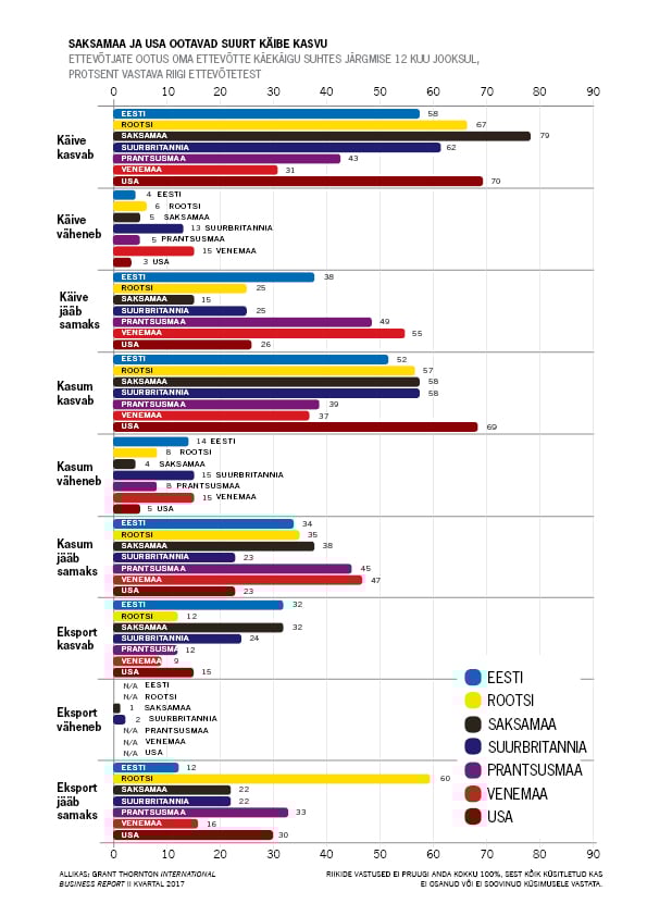 Kui vaadata riikide kaupa, siis eriti optimistlikud on tulevikuväljavaadete suhtes USA ettevõtjad, kelle nn optimismi indeks on viimase 14 aasta kõrgeimal tasemel. Ka teine maailmamajanduse seisukohast oluline suurriik, Hiina, paistab optimismi poolest silma – seal on optimismi indeks viimase kolme aasta kõrgeimal tasemel. Euroopas ootavad suurimat kasvu Saksamaa, Rootsi ja Hollandi ettevõtjad ning see on hea uudis Eestile, sest nimetatud riikidest kaks esimest on meie jaoks väga olulised kaubavahetuspartnerid ja ka Holland on Eesti ekspordipartnerite TOP 10-s esindatud.