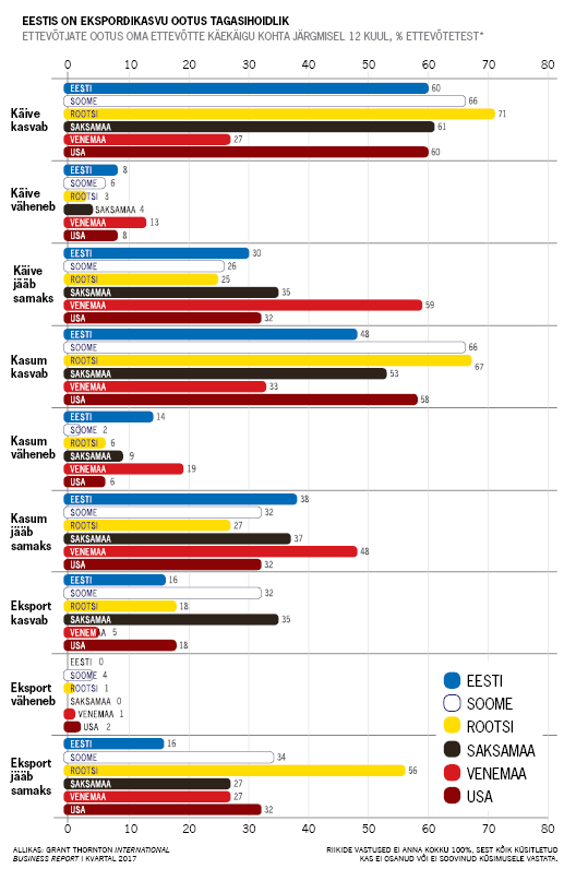 Samas on Eesti ettevõtjad ekspordikäibe suurendamise suhtes järgmise 12 kuu jooksul vägagi konservatiivsed: vaid 16% tänavu I kvartalis küsitletud ettevõtjaist uskus, et eksporti suudetakse kasvatada. Võrreldes 2016. aasta IV kvartaliga on ekspordi suurenemise prognoosijate osakaal suisa kaks korda vähenenud. Praegusest positiivsest konjunktuurist Soomes ja Rootsis saavad kasu lõigata küllap need Maarjamaa ettevõtted, kes varasematel aastatel on hoolimata majanduses valitsenud ebakindlusest suutnud ja julgenud investeerida – nendel on nüüd võimekus tootmismahtude suurendamiseks ja müügi edendamiseks.