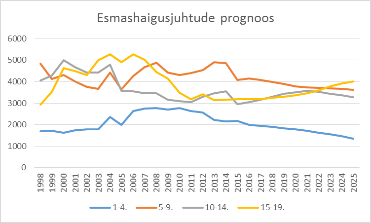 Uuringu käigus prognoosisime kvantitatiivsete meetoditega konkreetsete psüühiliste haiguste diagnoosidega laste võimalikku arvu tulevikus. Prognoosi tulemused, mis on toodud joonisel, näitasid tugevat kasvutrendi. Probleem kasvab jõudsalt ning ilmselgelt ei ole täna meditsiinisüsteemis selliste laste teenindamiseks piisavalt jõudu. On suurepärane, et erinevate haiglate juurde on sama rahastuprogrammi raames loodud laste vaimse tervise toad ning Tallinna Lastehaigla on avanud äärmiselt vajaliku laste vaimse tervise keskuse, kuid kindlasti on see vaid jäämäe tipp.